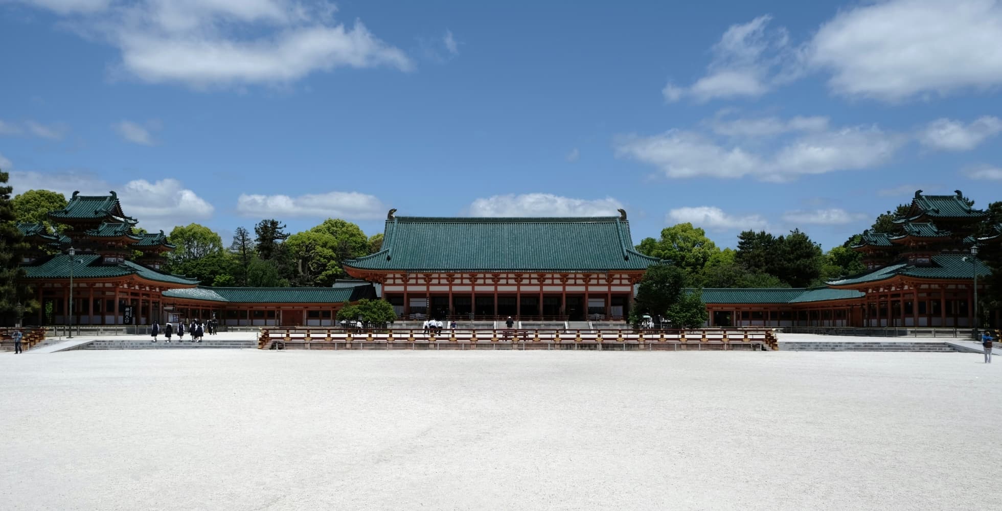 平安神宮の社殿は、桓武天皇が開かれた当時の平安京の正庁、朝堂院が約8分の5の規模で再現されています。大極殿(だいごくでん・外拝殿)・応天門(おうてんもん・神門)・蒼龍楼(そうりゅうろう)・白虎楼(びゃっころう)・歩廊・龍尾壇(りゅうびだん)などは明治28年(西暦1895年)の創建当時に造営されたものです。