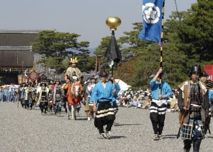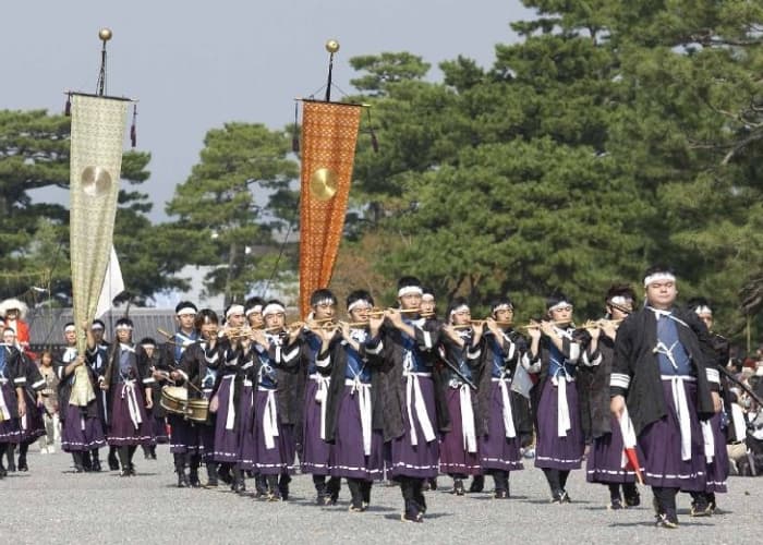 丹波国南桑田、船井両郡(京都府下)には、弓箭の技に秀でた人達が多く、桓武天皇平安遷都の際、その御列の警護に当ったともいわれ、その子孫の人々もまた明治維新の際には弓箭組を作り山陰鎮撫に当ったとも伝えられています。お供の人々は引立烏帽子(ひきたてえぼし)に直垂(ひたたれ)を着け、太刀を差し弓箭を携え、時代祭創設当初より御祭神の警護役を担っています。