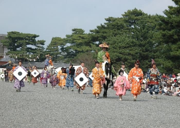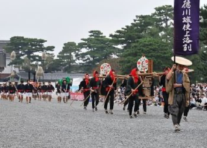 徳川幕府は、朝廷の大礼などの大切な儀式や年始などの際には必ず城使を上洛させ、皇室に対し礼を厚くしていました。城使には親藩・譜代の諸侯が選ばれ、ことに即位の大礼には将軍家名代が多数の従者をしたがえ、その服装器具などは非常に華美なものでした。 本列は普通の場合を模したもので、城使は騎馬で、乗物の駕籠は幕末当時の形式をとったものです。先頭の槍持、傘持、挾箱持など奴(やっこ)が発声する「ヒーサー」の掛け声や動作は当時の面影を偲ばせてくれます。