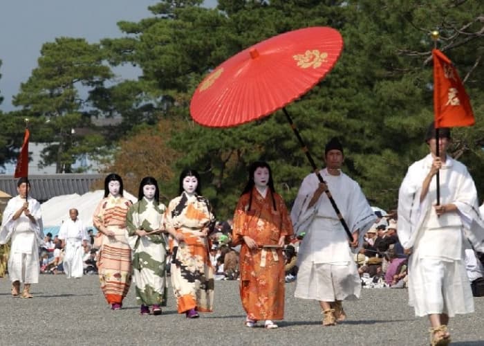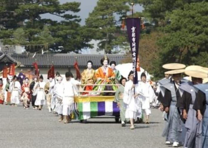 江戸時代の京都で話題となり活躍した女性が登場します。和宮(かずのみや)はご祭神孝明天皇の御妹君で、公武合体のため将軍家茂に降嫁されました。行列では輿入前16歳頃の近世女房(にょうぼう)装束で宮廷内のお姿を表しています。蓮月(女流歌人。後年尼となり蓮月と称しました)玉瀾(池大雅の妻)閨秀画家として南画をよくしました。中村内藏助の妻(京都銀座で巨万の富を築いた妻)妻女の衣裳比べで抜群の誉れを得たといわれ、『翁草』の記事により考証されています。お梶(女流歌人で、祇園に茶店を営んでいました)吉野太夫(寛永の頃、京都六条三筋町の名妓、後に豪商灰屋紹益の妻となりました)出雲阿国(出雲大社の巫女)京都四條河原で「やや子踊」や「かぶき踊」演じ、歌舞伎の創始者とされています。