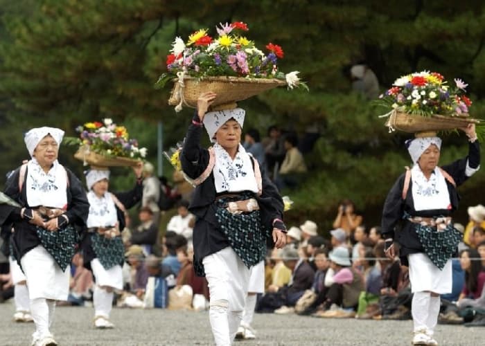 比叡山を源に発する白川の流域に住み、季節の花を売り歩くのを業とする女性が白川女(しらかわめ)です。その歴史は古く、平安時代中頃から御所に花を届けていたともいわれています。 本列は伝統的な白川女姿で、神前に献花する花を頭にのせています。