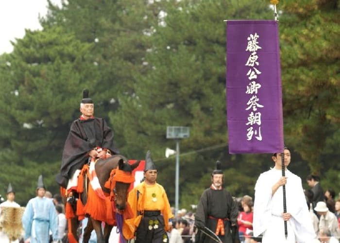 平安時代中期以降、藤原氏が隆盛を誇った時代の文武両様の姿を現したものです。 平安時代末期に唐様式が薄れ日本独自の国風文化が成熟し、強装束(こわしょうぞく)がおこり、大いに容儀が整えられた頃の服装にならったものです。この列は藤原氏全盛期の文武両様の王朝風俗で、参朝する位の高い貴族の文官、武官の夏の正装姿です。